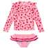 Dive into summer with this fun and fruity rash guard swim top and bikini bottoms set. Adorned with a lively watermelon print featuring hints of gold foil and playful shoulder frills, this set includes a rash top designed with UPF50+ fabric for maximum sun protection and super cute frill bottom. Perfect for little adventurers who love to splash and play.