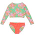 Have fun in the sun with this crop top rash guard set. The top is lined for extra comfort and has a secure elastic hem, perfect for all-day surf and sand. The reversible bottoms flip between vibrant neon coral and a gorgeous mint seashell print, making it easy to mix things up for any beach adventure or pool day.