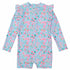 Your little one can play in the sun safely in this long-sleeved baby sunsuit adorned with a charming daisy print and playful shoulder frills. The convenient zip closure at the back ensures easy dressing, while the raw-edged frills add a touch of whimsy to this essential piece for sun-filled adventures.