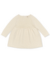 The sweetest little dress you ever laid eyes on, featuring delicate, elegant stitching on chest with scalloped edges on the hem and sleeves. Wood button at the back of the neck adds another darling detail and makes the dress easy to go over your child’s head.