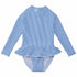 Capture the elegance of a Parisian summer with this skirt surf suit, styled in classic blue and white seersucker stripes. It features a white zip at the back and delightful white pompom trim, merging chic design with sun safety.