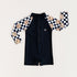 Your beach rebel will stand out from the crowd in this edgy rashguard with rad checker sleeves and cheeky happy faces – designed with an easy on/off zipper by a mom who knows the struggle is real when it comes to peeling wet swimwear off squirmy kids!